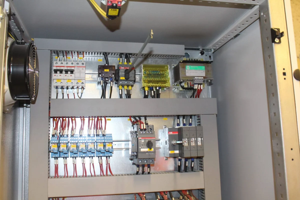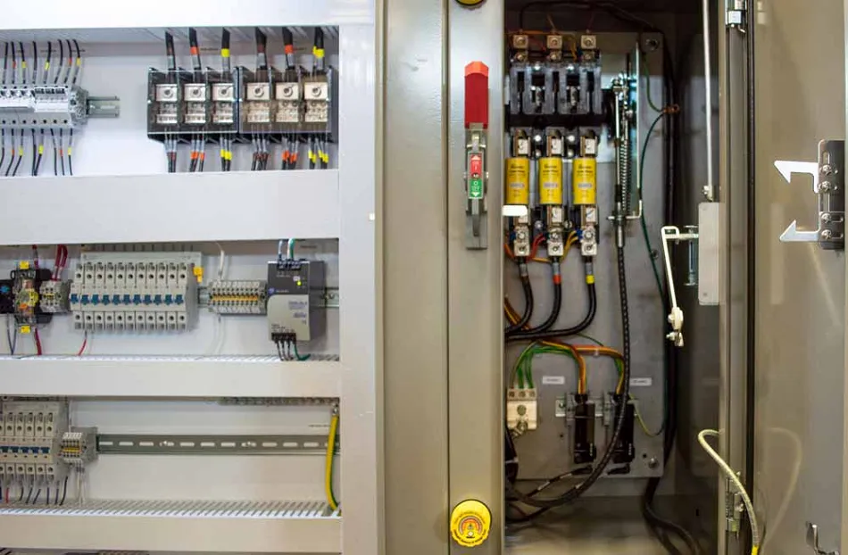 اللوحة الكهربائية هي صندوق معدني يحتوي على مجموعة من المفاتيح، والكونتاكتورات، والفيوزات، والقواطع، وأجهزة التحكم التي تنظم مرور التيار الكهربائي إلى مختلف أجزاء النظام الصناعي.